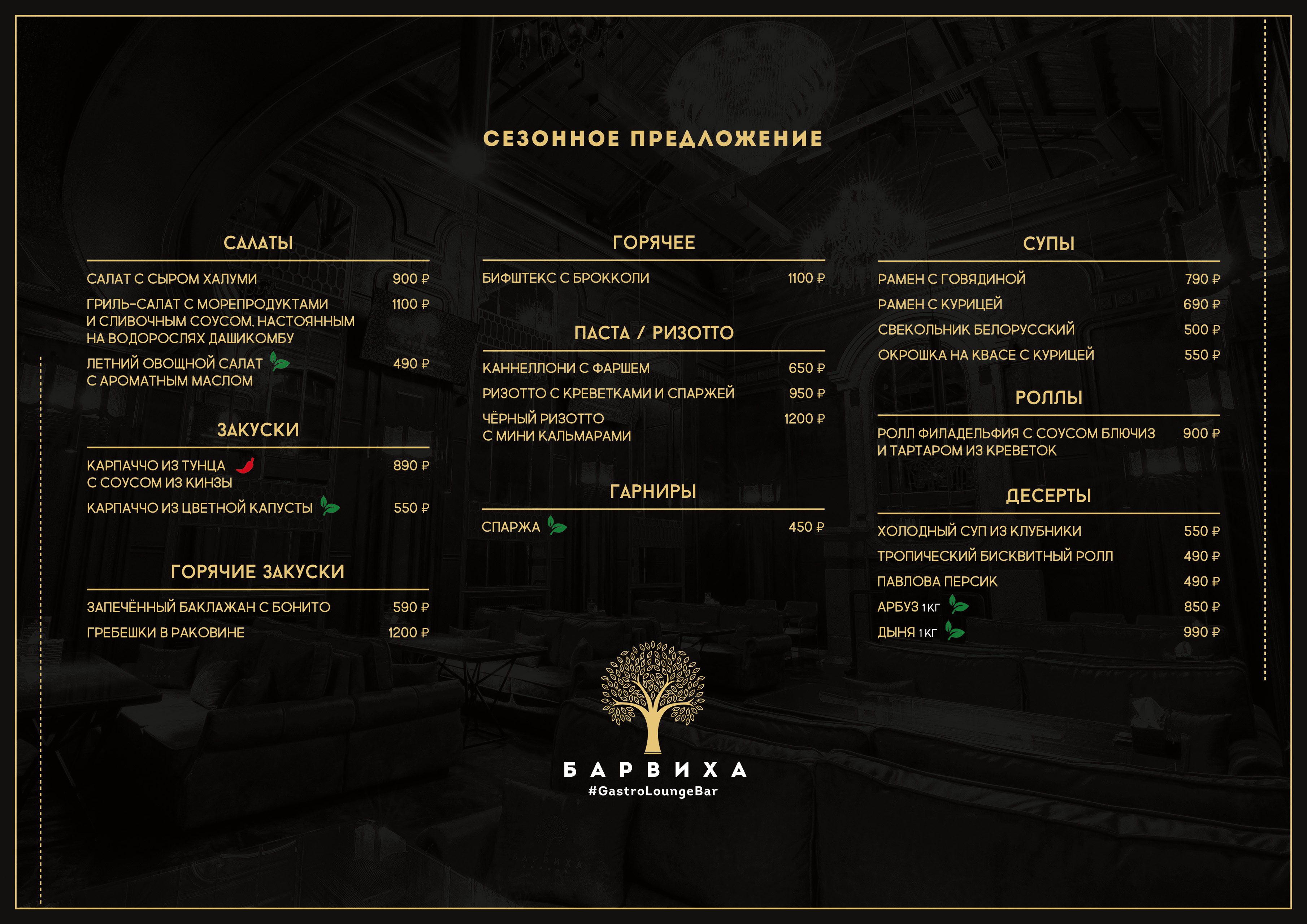 Разрабатывая меню, бренд-шеф заботился о балансе вкусов и оформлении каждого блюда, чтобы вы наслаждались результатами кулинарных процессов поваров Барвиха Lounge.