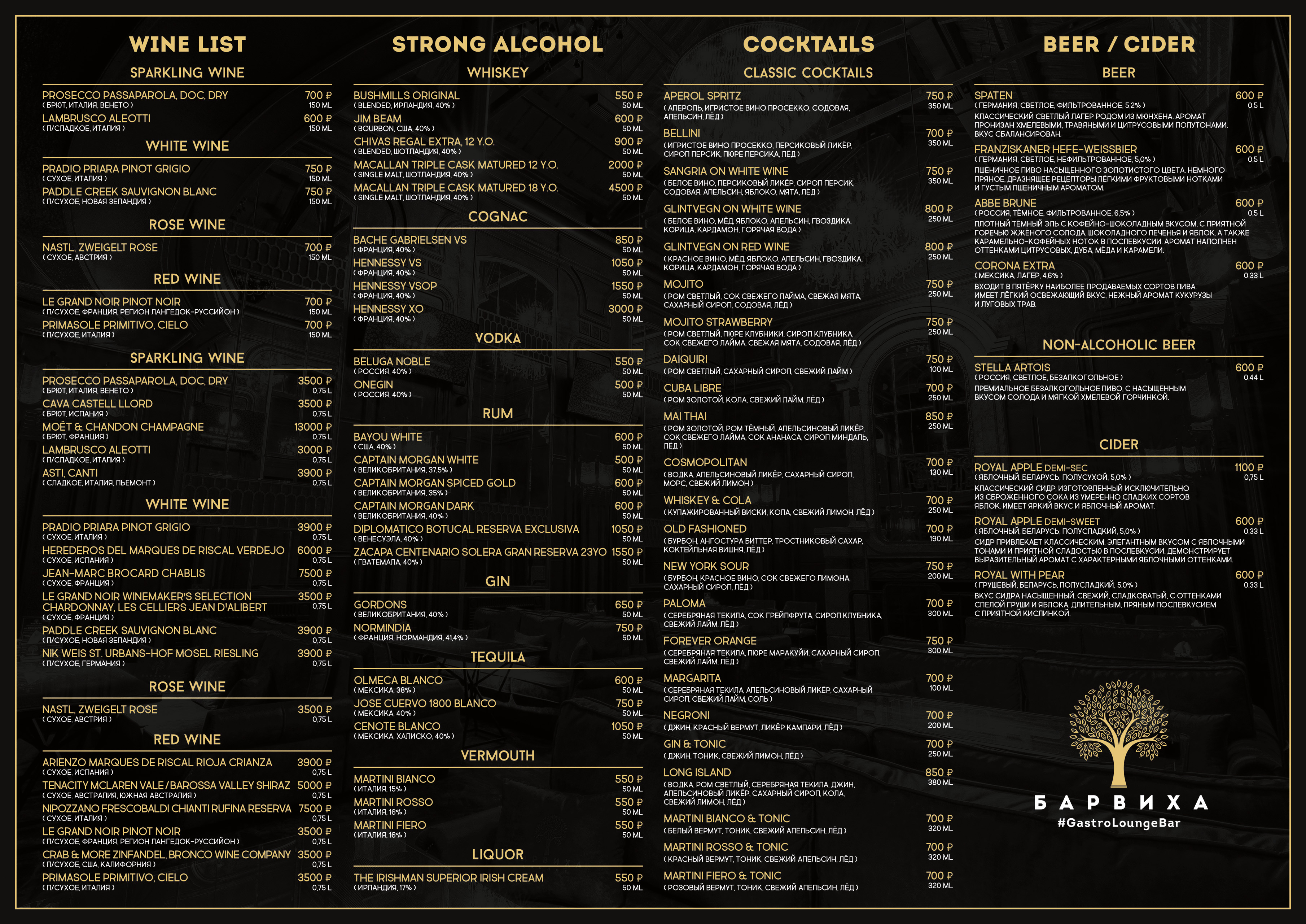 Знакомство с баром Барвиха Lounge стоит начать с авторского коктейля или оригинальной чайной композиции. А для тех, кому по вкусу классика, в меню предоставлен широкий ассортимент базовых напитков.